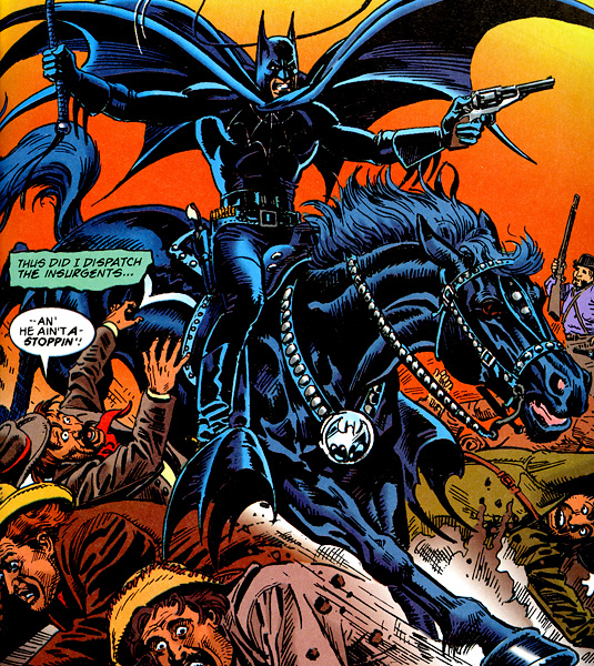 Com inspirações claras em Zorro e Cavaleiro Solitário, Elliot S. Maggin constrói em Batman – A Guerra da Secessão (1992) uma história com alguns pontos muitos interessantes no que concerne a adaptação do Batman que conhecemos para o Batman desse mundo em guerra, onde os escravagistas do sul são confrontados pelo Tenente-coronel Bruce Wayne e seu Robin índio, chamado Pássaro Vermelho. O foco central é a busca por uma grande quantia em dinheiro roubada pelos confederados, quantia essa que serviria para financiar a guerra do Norte.
