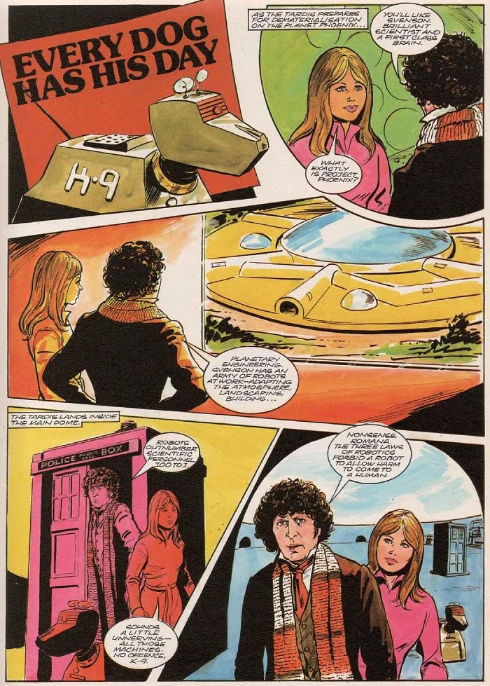 K-9 é um personagem incrível, não há como negar. Mas quando ele recebe mais atenção do que outros aliens à sua volta — e não digo que ele não deva ter atenção, mas que haja um equilíbrio — o enredo perde um pouco a graça. A situação piora quando existe uma história que brinca com as Leis da Robótica de Asimov, o que por um lado é interessante, mas chega a ser infantil ver isso saindo da boca do Doutor, principalmente em uma colônia terráquea num planeta distante onde se desenvolvia inteligência artificial. Até o Doutor citar as leis e esperar que elas estivessem sendo obedecidas, tudo bem. É até engraçado. Mas toda a crença dele é direcionada para esse ponto, num nível de estupidez quase religiosa que não existe no Doutor e que repete o mesmo terrível comportamento observado em The Weapon, nos quadrinhos do ano anterior, ou seja, simplesmente incompreensível.