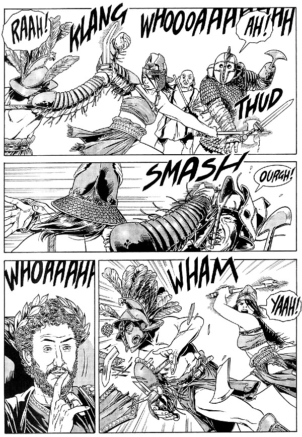Nesta sétima edição, o enredo traz, inclusive, uma exposição comportamental diferente para a protagonista, que parece muito ligada à humanidade desse período, fazendo com que seu nome seja aclamado pela arena e gostando da sensação que isso lhe traz. O elemento ucrônico gerado me faz ter muita curiosidade para o que o autor tem em vista para o fim da série, uma vez que Lilith altera a história de maneira absolutamente substancial neste volume. Em vez de ser assassinado no dia 31 de dezembro de 192, aos 31 anos de idade, Cômodo é salvo pela cronoagente, inicia o culto à deusa Lilith e volta a perseguir os cristãos. Isso com certeza terá um impacto no futuro da História da humanidade, e me pergunto o quanto essas mudanças interferirão no mundo de séculos adiante, de onde Lilith vem.