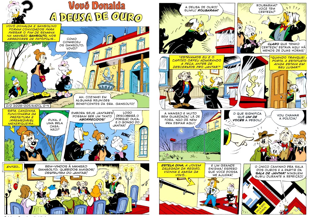 Achei a resolução bastante engenhosa, embora o texto não cubra todas as possibilidades (e impossibilidades) que apresenta no caminho, especialmente no que diz respeito à escalada na parede externa da mansão até a janela onde estão as estátuas de ouro de Gansolto. Mas o processo de pensamento da Vovó Donalda é afiado, olhando aquilo que as pessoas normalmente desprezam no cenário e fazendo jus à velhinha observadora na qual é baseada nessa série. E como de praxe, eu não consegui descobrir quem era o criminoso da vez.