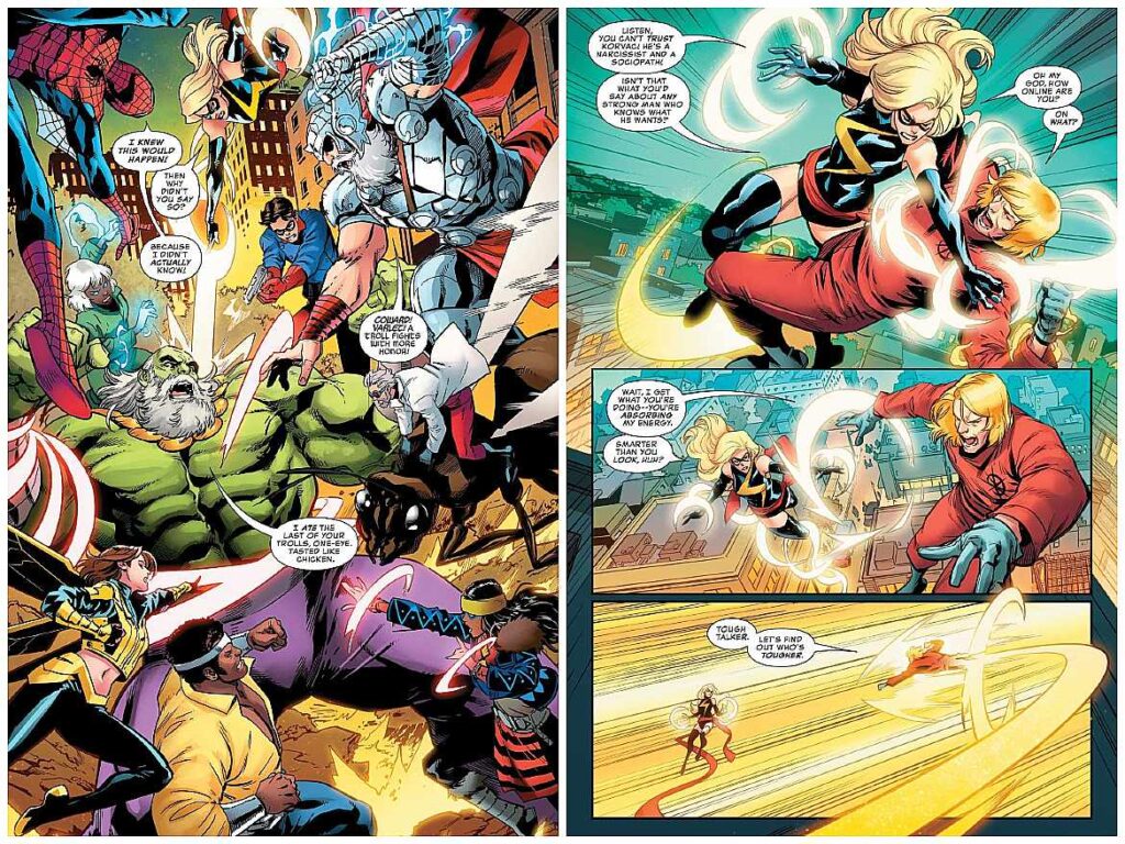 Há diversas outras versões de personagens conhecidos, incluindo do New Universe e da Crossgen, que são supreendentemente muito bem utilizados no cabo de guerra entre Korvac e Pym, mostrando que Gage, mesmo muito claramente seguindo o mandamento da editora de usar a nostalgia como arma, consegue fazer algo bem mais interessante e bem acabado do que a média em situações assim, como é o caso do frustrante, mas inacreditavelmente adorado longa Deadpool & Wolverine. É particularmente alvissareiro notar como Hank Pym é bem desenvolvido, especialmente em oposição à sua esposa de outro universo que vê nessa versão mais velha do marido que nunca teve oportunidade de conhecer alguém tão cheio de traumas que ela tem problemas em se aproximar. Igualmente, Gage tem a rara capacidade de colocar os heróis em seus “devidos lugares”, ao expressamente afastar personagens menos poderosos como o Aranha ou totalmente sem poderes como Bucky, levando-os a agir quase que nos bastidores, mas sem serem esquecidos por um minuto sequer.