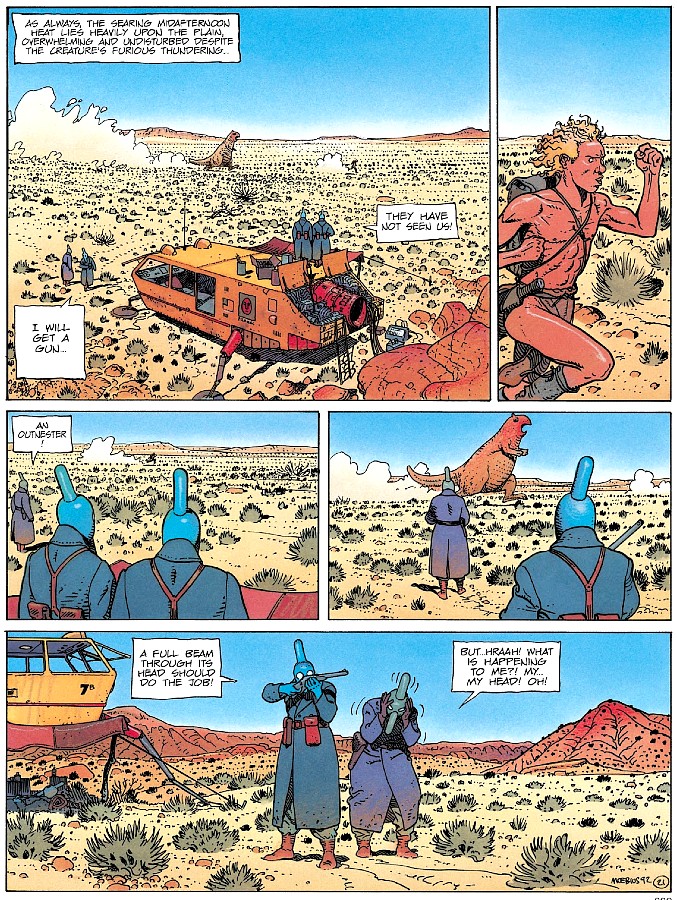 De cara, a aventura aqui é muito mais prática do que a anterior, com o protagonista se movimentando bastante, enfrentando obstáculos concretos e tomando decisões urgentes, ao passo que a concepção estética atinge um patamar ainda mais sofisticado, com uma belíssima aplicação de cores e diagramação mais expansiva — com desenhos bem mais detalhados, quadros maiores e alteração entre preenchimento máximo das páginas com cenários gigantescos e “simples” — que fazem das paisagens desérticas e vulcânicas um bom espetáculo visual com atmosferas distintas. Publicado pela Casterman em 1994, o álbum foi iniciado na Califórnia e finalizado na França, e incorpora de maneira bem perceptível as práticas de instintoterapia (instinctothérapie) e meditação às quais Jean Giraud estava ligado naquele período. Explorarei mais esse aspecto conceitual adiante.