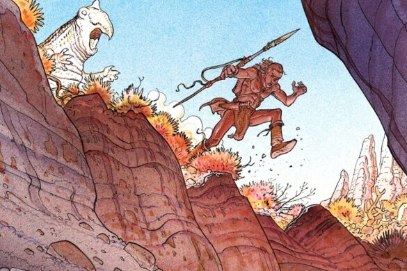 De cara, a aventura aqui é muito mais prática do que a anterior, com o protagonista se movimentando bastante, enfrentando obstáculos concretos e tomando decisões urgentes, ao passo que a concepção estética atinge um patamar ainda mais sofisticado, com uma belíssima aplicação de cores e diagramação mais expansiva — com desenhos bem mais detalhados, quadros maiores e alteração entre preenchimento máximo das páginas com cenários gigantescos e “simples” — que fazem das paisagens desérticas e vulcânicas um bom espetáculo visual com atmosferas distintas. Publicado pela Casterman em 1994, o álbum foi iniciado na Califórnia e finalizado na França, e incorpora de maneira bem perceptível as práticas de instintoterapia (instinctothérapie) e meditação às quais Jean Giraud estava ligado naquele período. Explorarei mais esse aspecto conceitual adiante.