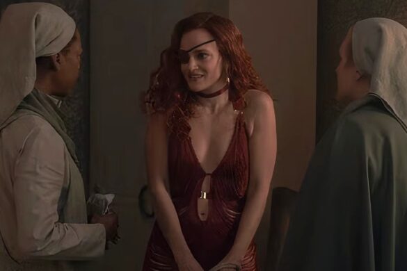 Depois do susto de qualidade menor que tivemos em Promotion, chegamos ao meio da temporada com o episódio Janine, e vemos The Handmaid’s Tale voltar aos eixos com pompa e circunstância, resgatando sua potência narrativa ao entregar uma história tensa, com camadas psicológicas e um comentário afiado sobre poder e resistência. Sob a direção da brasileira Natalia Leite (que na 5ª Temporada dirigiu a obra-prima No Man’s Land) e com roteiro de Ubah Mohamed (em sua primeira contribuição para a série), a história gira em torno da arriscada missão de June e Moira para resgatar Janine da Casa de Jezebel, o bordel onde ela é forçada a assumir a persona de “Kitty” pelo nojento Comandante Bell (Timothy Simons). A fotografia de Steve Wilkie joga com contrastes de luz, das cores difusas das salas do bordel às sombras que engolem os corredores e a cidade, criando uma atmosfera sedutora e sufocante. Cada quadro parece sussurrar o custo da sobrevivência em Gilead, onde a aparente beleza é uma máscara para a violência e a vigilância nunca descansa, algo que a gente já sabia, mas que com todas as reformas, fomos forçados a esquecer.
