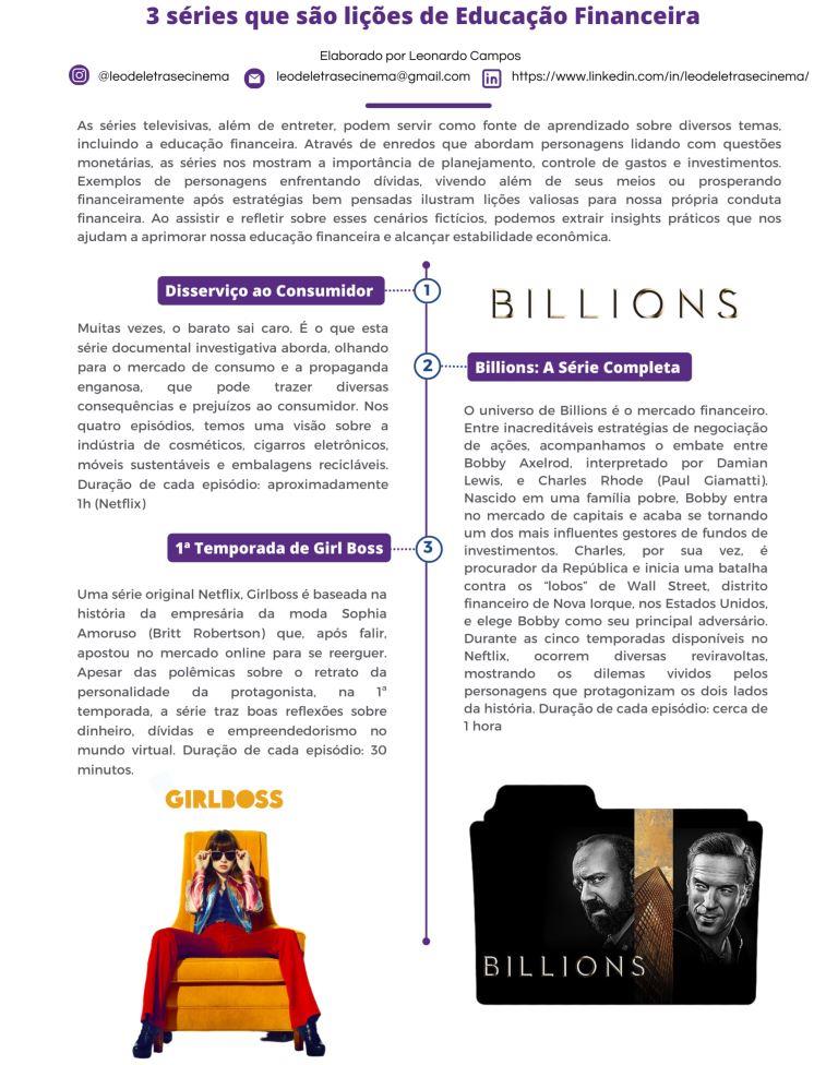Na websérie brasileira R$100 Neura, a youtuber Fernanda faz os espectadores se divertirem e aprenderem educação financeira, nos episódios de cinco minutos, ideais para propostas pedagógicas sobre o assunto. Inspirada em situações aparentemente banais do cotidiano, o material demonstra como ter conhecimento sobre gastos e educação financeira são bases para a construção de pilares sólidos na vida adulta. Interpretada por Raissa Venâncio, a personagem também aborda poupança, numa linguagem acessível, cheia de referências ao mundo da cultura pop. Assinada pela Roquette Pinto Comunicação Educativa, em parceria com a AEF Brasil, a produção em 13 episódios diverte e reflete, tal como o didático e atraente Os Delírios de Consumo de Becky Bloom, tema do nosso próximo tópico sobre educação financeira e narrativas ficcionais. Antes de analisar a narrativa protagonizada com carisma por Isla Fisher, amarro este bloco com a série Billions, criada por Andrew Ross Sorkin, David Levien e Brian Koppelman. Na trama, Chuck Rhoades (Paul Giamatti) é um promotor público que investiga irregularidades nos negócios de Bobby Axelroad (Damian Lewis), responsável por um poderoso fundo de multimercados. Dentre os tantos temas, a série reflete como é importante termos conhecimentos mais que básicos sobre finanças para que possamos compreender os nossos negócios, investimentos e renda que pode variar a qualquer momento.