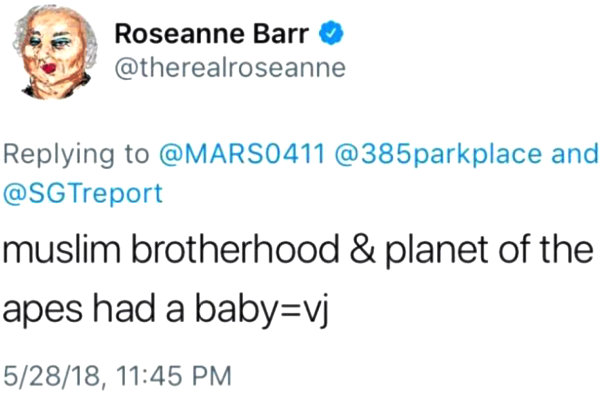 Seguindo a onda saudosista de ressuscitar o que quer que tenha feito sucesso no passado, a emissora trouxe a série de volta, em 2018, para uma 10ª Temporada, que, como esperado, chamou atenção do público e da crítica e ganhou a esperada renovação. Isso até o tuíte de Roseanne Barr em 29 de maio de 2018. Como vocês viram no título, ela não se fez de rogada ao, como diria depois, “fazer uma piada ruim“, “uma brincadeira” e que “deveria ter pensado melhor“, ao comentar a aparência de Valerie Jarrett (a “VJ” do tuíte), ex-Assessora Sênior de Barack Obama, entre 2009 e 2017. E só para constar, Valerie Jarrett nasceu em Xiraz, Irã, filha de pais americanos — o pai era médico, e estava no Irã, com a família, a trabalho, isso em 1956.